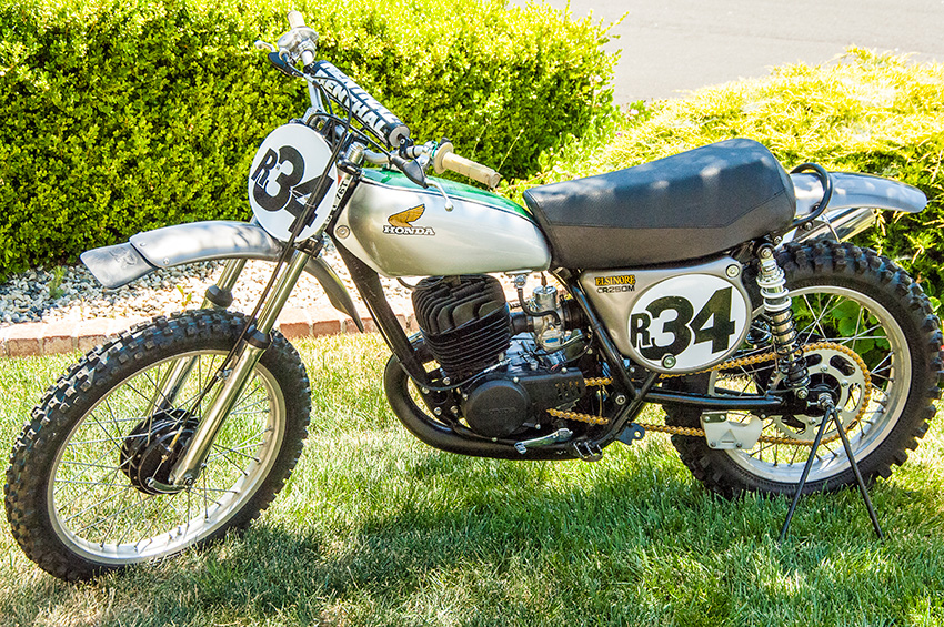 I bought a modern Gripper seat cover and had it grafted to the replacement stock cover for a nice gripper seat on the ‘ole Elsie. After the first ride (after years of bikes with gripper seat covers) I decided to do a trick seat. Fresh RK gold chain and sprockets, Bridgestone M22 rear and Bridgestone M403 front. Works Performance dual spring shocks. Mikuni VM 36 carb.