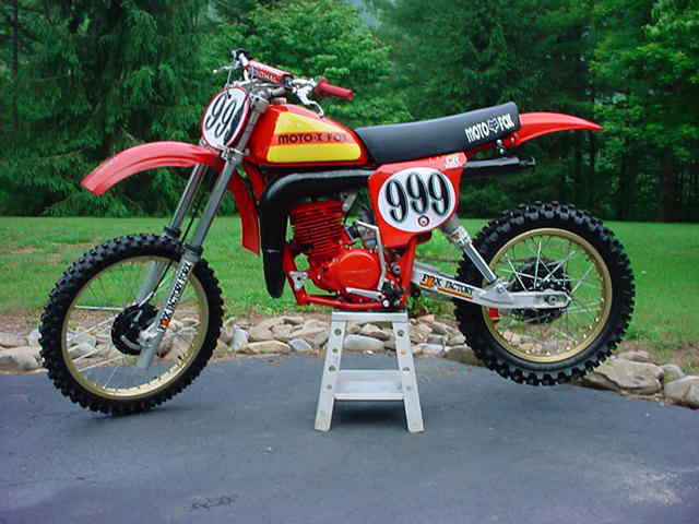 Well I built this bike this past spring or redid it after having restored it about 12 years ago. When I finished it this year it had 81 CR 250 forks and Fox airs and an aluminum works swingarm, it looked like a factory racer Smith or Lackey would have raced back in the day. I was well pleased with the look as I had also used all the Fox aluminum replica parts that were available, I had some zero nine numbers, bought a silencer from Rick Horvat.