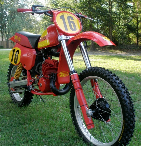 A few more details about the bike, the cylinder has been ported, rebored to 1st over with a steel sleeve and Wiseco piston, the transmission shifts perfectly and is in like new condtion. V-force reeds compliment the powerband and every bearing and every seal is new in both the engine and chassis, all tolerances are well within specs and the bike was built as if I were prepping it for a national race. The Ohlins shocks are new and are sprung and valved to my specs via "steve the shock guru" at Ohlins. The forks are off a 1982 CR480R (modified by the way), the clamps and front wheel (including the double leading shoe front brake) are off a 1983 CR480R. The swingarm is off of a 1981 CR450R, I machined off the linkage sections and added the shock mounts, the rear brake arm is a modified piece. The front fender is a Preston Petty replica. The pipe is stock and in perfect condition and the silencer is an aluminum aftermarket from a 1983 CR. Motor mounts are aluminum. Igintion box is the preferred “E” version. Seat foam is new and stiff. Bars are modern Renthal (Carmichael bend) and the cross bar pad is an original DeBruiser. All normal moving parts are new of course, chain, sprockets, cables, etc.